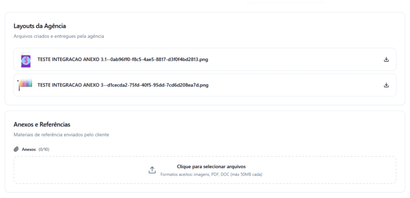 - Organização Visual: a etiqueta de diferenciação de layouts separa o que é arquivo entregue pela agência do que é referência enviada pelo cliente, acabando com as confusões de arquivos.