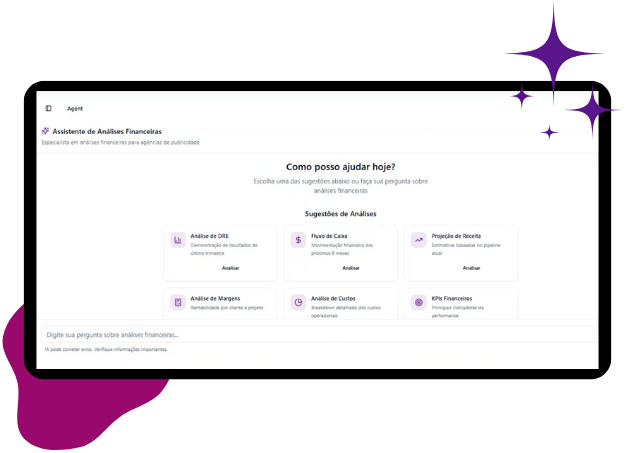 A IA detecta tendências e problemas invisíveis em análises tradicionais, como queda de rentabilidade em clientes, projetos com estouro de horas e gargalos operacionais.