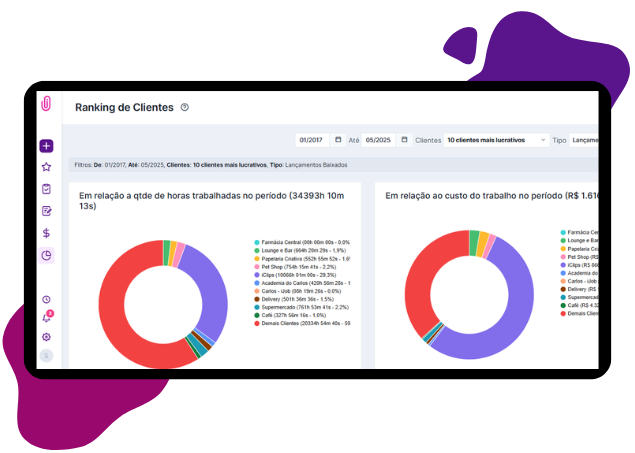 Por meio do ranking de clientes, encontre as melhores oportunidades de acordo com valores faturados, comissões, custo de horas trabalhadas e a lucratividade que cada cliente representa para a agência.