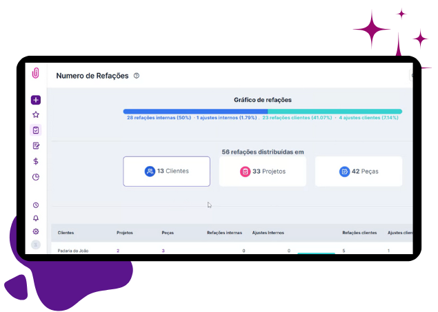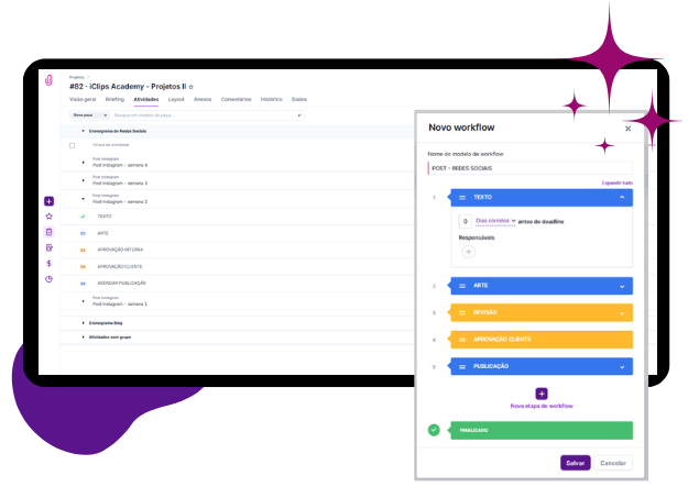 Crie workflows personalizados de acordo com o fluxo de trabalho da sua agência, tornando o trabalho mais dinâmico e eficiente. Isso possibilita visualizar possíveis gargalos em cada uma das etapas e observar qual delas contém mais atrasos e refrações.