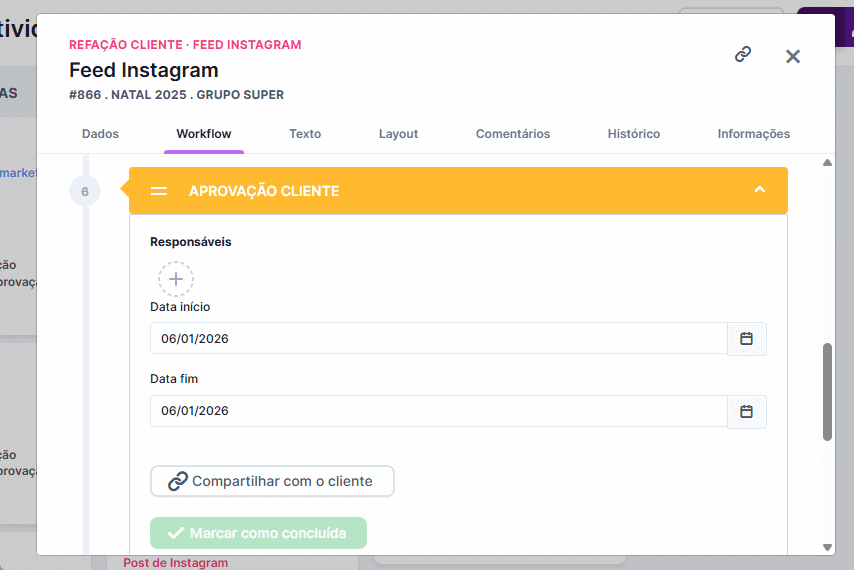 - Gestão de Atividades (NOVIDADE): Caso o cliente não consiga ou se esqueça de realizar a aprovação, a agência pode utilizar o botão de Marcar como Concluída para que a peça siga para a etapa seguinte.