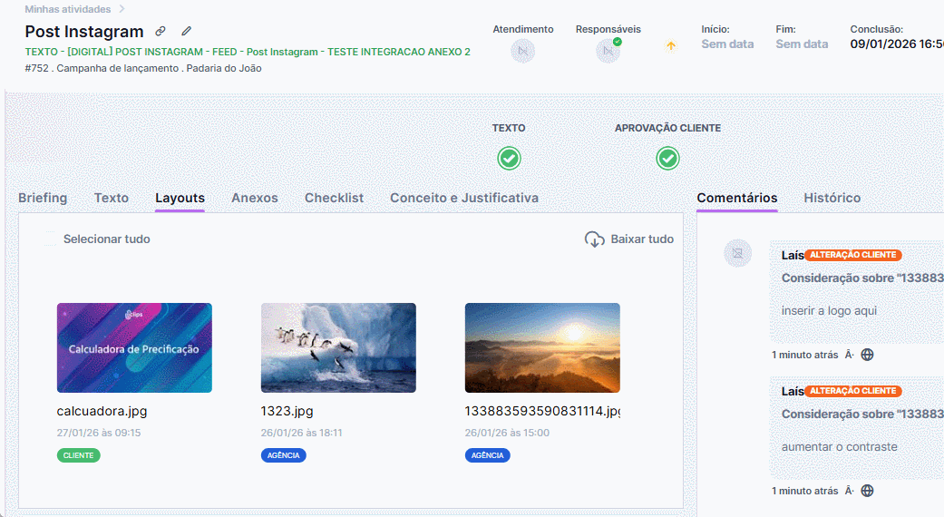 - Conteúdo da atividade: o cliente visualiza textos, layouts, briefing e comentários da peça com um clique, sem precisar editar o projeto. As informações ficaram mais organizadas, facilitando a vida do seu cliente.