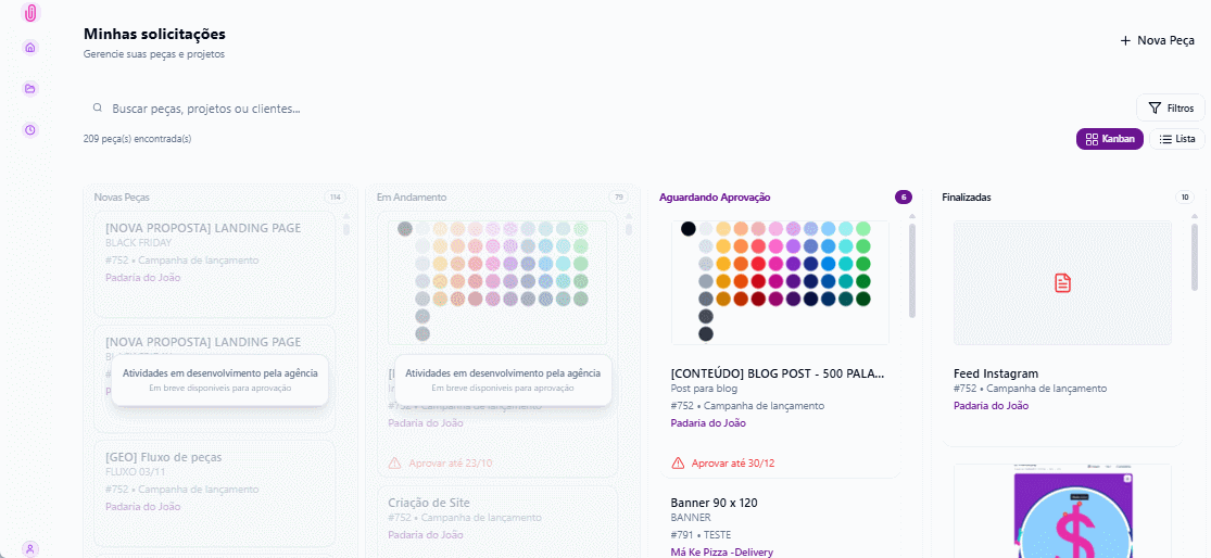 - Dashboard Kanban e Lista: no kanban o foco continua sendo nas peças aguardando aprovação, mas na visualização em lista ele acompanha tudo o que está em andamento. Nas duas visualizações o cliente pode utilizar os filtros para buscar por palavra-chave, status, cliente ou projeto.