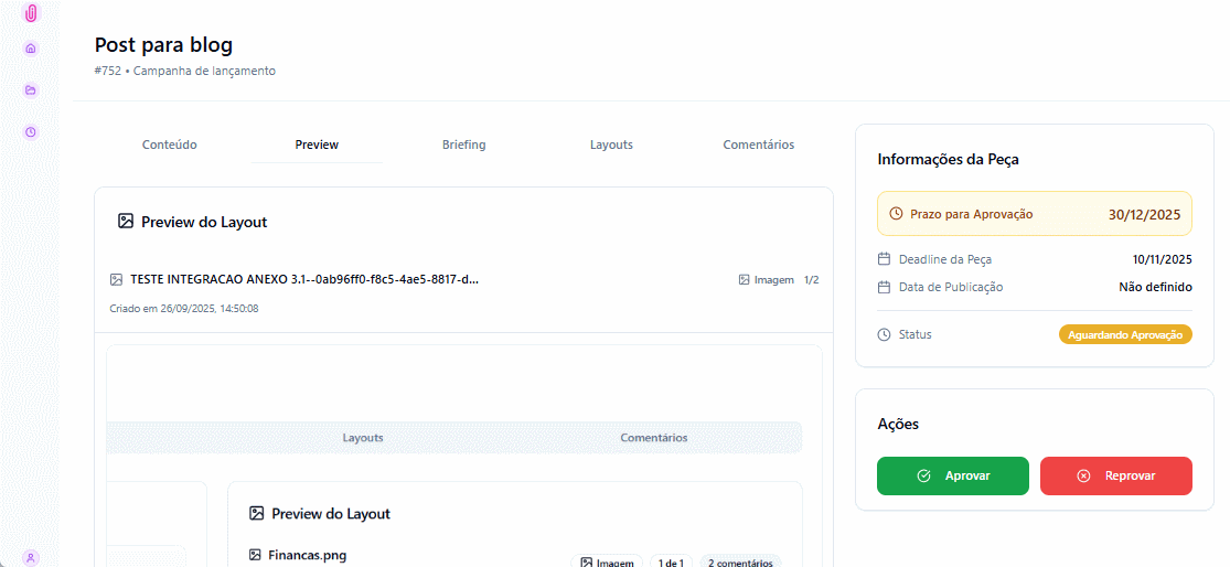 Dica: O cliente recebe um e-mail automático quando a peça entra em aprovação, mas a agência pode sempre reforçar enviando o link direto gerado no sistema.