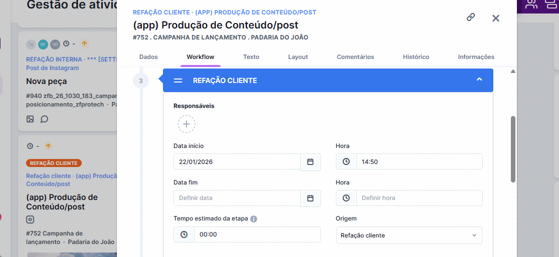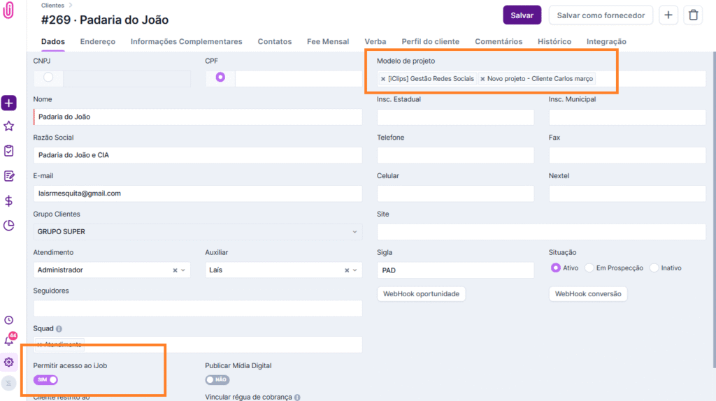 - Você pode incluir um Modelo de Projeto dentro do cadastro do cliente. Isso garante que, quando o cliente abrir um novo projeto, ele siga o padrão definido pela agência, facilitando a entrada da demanda.