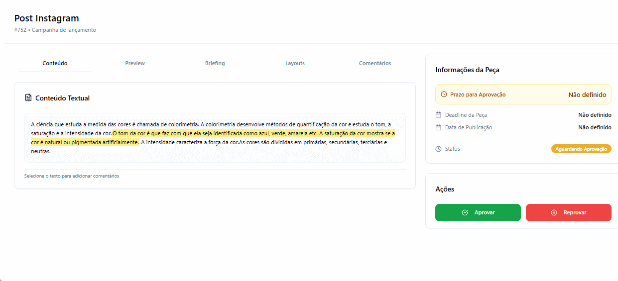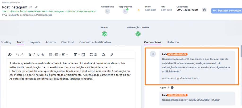 Marcação em textos: na aba de Comentários, a agência visualiza o trecho específico destacado pelo contato e a respectiva instrução, facilitando a compreensão do ajuste solicitado.