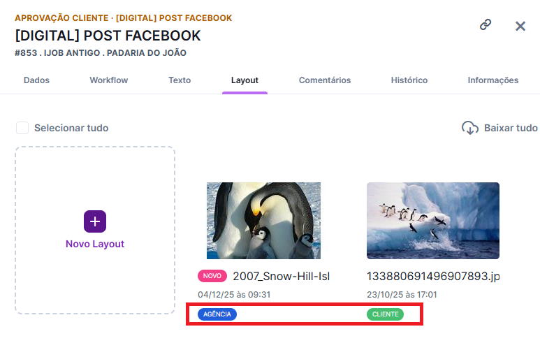 - Anexos em Peças (NOVIDADE): O cliente pode anexar arquivos diretamente nas peças, seja no momento da abertura de uma nova peça, seja durante a sua execução. No iClips, você verá etiquetas diferenciando o que é Layout Agência e o que é Anexo Cliente.