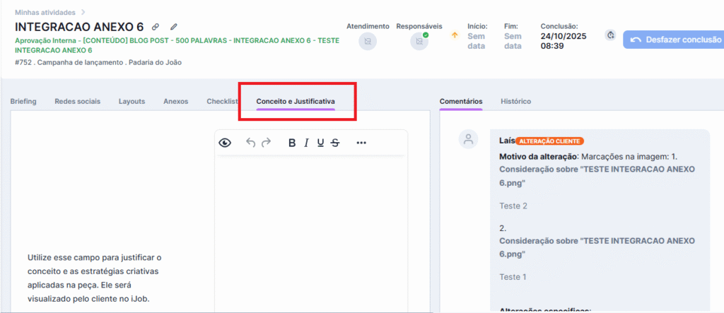 - Conceito e Justificativa (NOVIDADE): Use o campo especial de conceito para explicar a estratégia da entrega.
