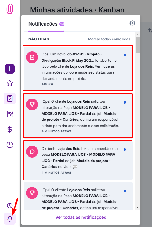 - Notificações: O Atendimento do projeto recebe alertas quando o cliente aprova, reprova, comenta ou abre solicitações. O cliente agora pode comentar independente do status da peça, por isso é importante ficar ligado nas notificações de novos comentários.