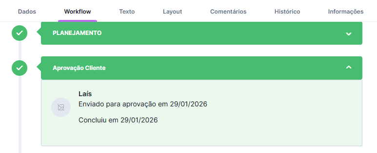 - Controle de datas (NOVIDADE): o workflow exibe a data de envio vs. a data real da aprovação.