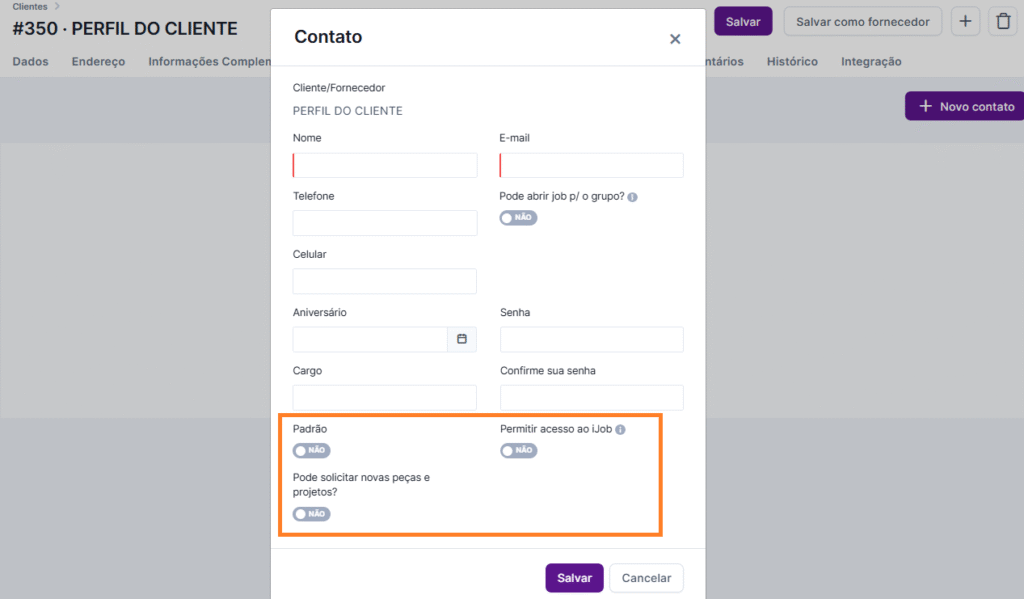 - Contato Padrão (NOVIDADE): Se marcado como Sim, este contato será selecionado automaticamente sempre que uma peça ou etapa de aprovação cliente forem inseridas em um projeto desse cliente.