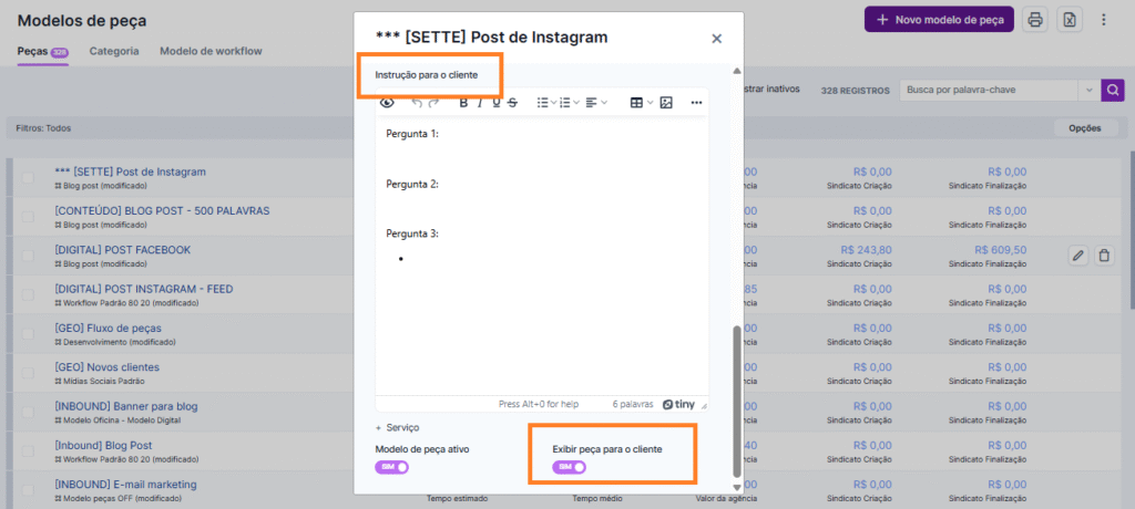 - Em Configurações > Modelos de Peça, ao clicar em uma peça, você pode preencher o campo Instrução para o cliente. Assim, ao solicitar uma nova peça, ele verá suas dicas sobre como preencher o briefing corretamente.