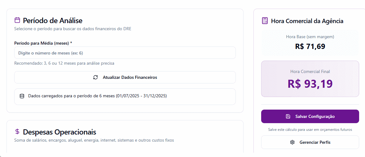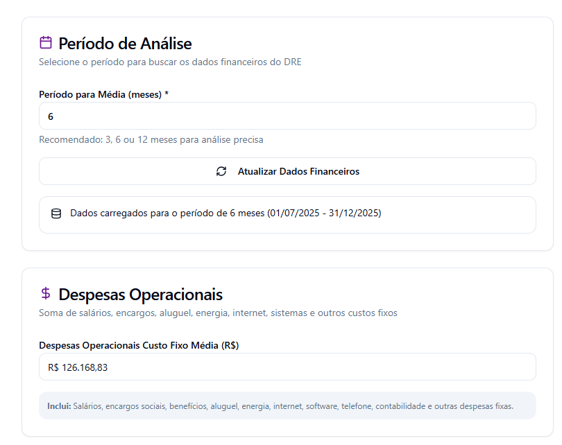 O primeiro passo consiste em definir um período para a média (por exemplo, 6 meses). Ao clicar em “Atualizar Dados Financeiros”, o sistema irá extrair a média das despesas operacionais e custos fixos do seu DRE para esse intervalo, permitindo também a edição manual destes valores, se necessário. Para entender como o cálculo do valor da média de despesas operacionais é feito consulte nosso artigo sobre a Calculadora de Valor Hora.