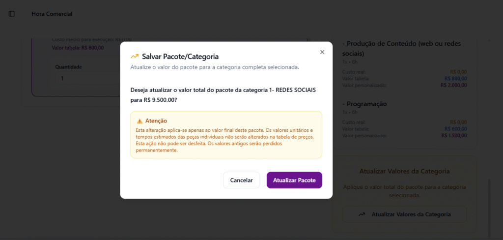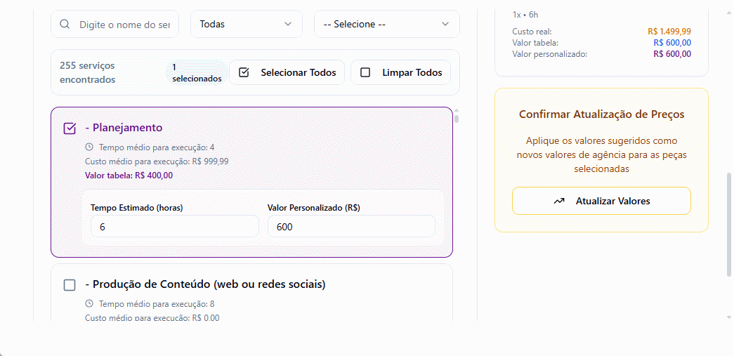 4. Atualização: Ao clicar em “Atualizar Valores”, o novo valor agência é guardado. Se desejar que o novo tempo estimado se torne o padrão no sistema, marque a opção correspondente antes de atualizar.