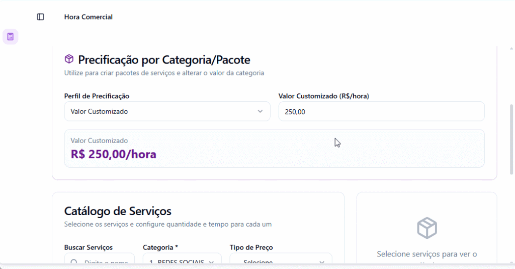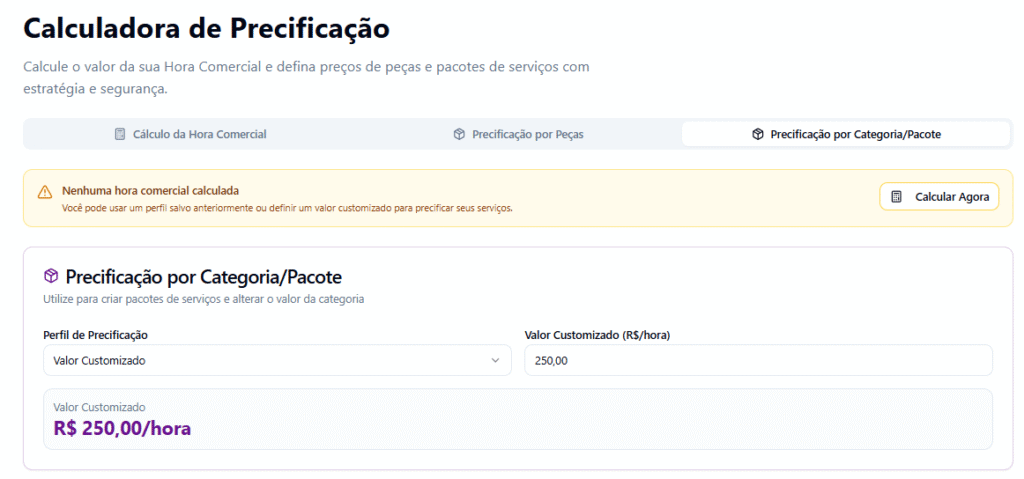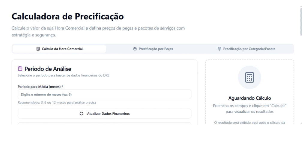 A Calculadora de Precificação chega como uma ferramenta essencial para definir o valor da sua hora comercial e o preço dos seus serviços (peças e pacotes) com estratégia e segurança.