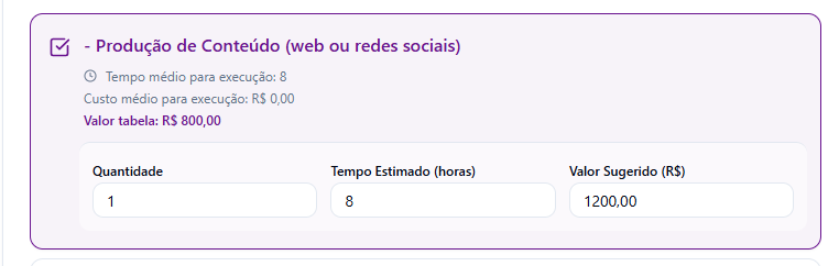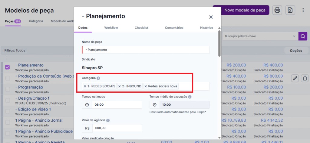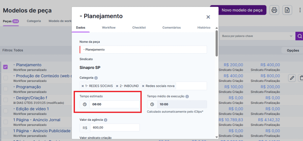 Todas as alterações feitas na calculadora (como o tempo estimado ou valor agência) refletem-se automaticamente em Configurações > Modelos de Peça.