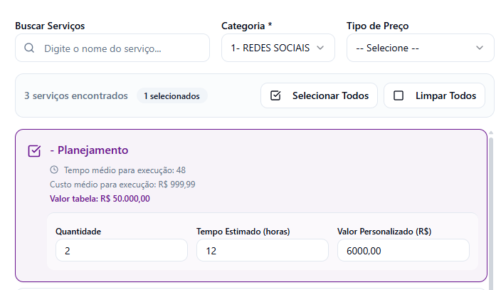 • Selecione o perfil de precificação que será utilizado. Você pode usar um dos perfis previamente cadastrados ou selecionar a opção Valor Customizado e inserir o novo valor desejado.