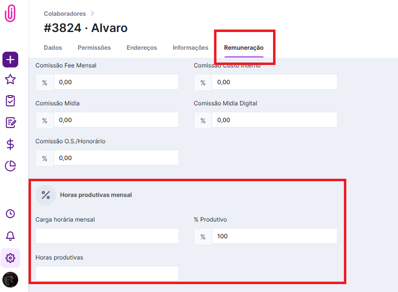 • Dados vindos do cadastro do colaborador: Quando os campos Carga Horária Mensal e % Produtivo estão preenchidos na aba Remuneração do cadastro de cada colaborador, o sistema soma automaticamente as horas produtivas de todos os colaboradores ativos.