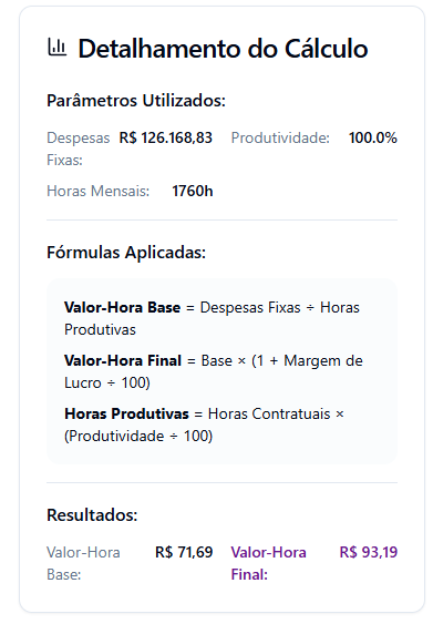 No canto superior esquerdo da tela você verá o resultado do valor hora com e sem a margem de lucro.