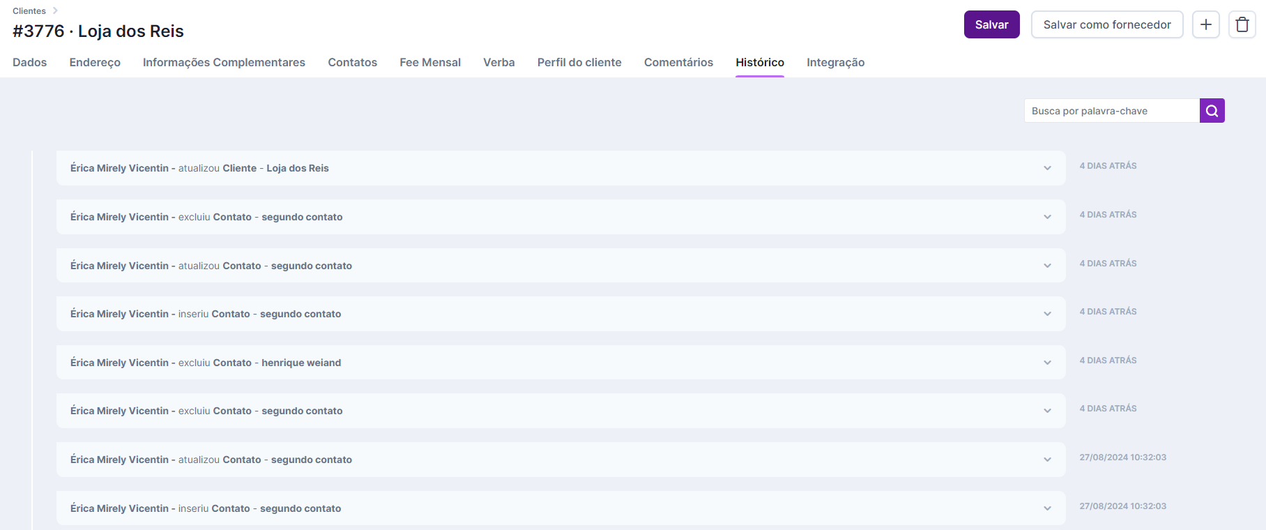 Em Histórico estão todas as informações que preenchemos até agora relativas ao cliente. Eles são automáticos, ou seja, aparecem logo após você realizar alguma ação dentro do cadastro do cliente. Nesta tela, tudo o que é feito para esse cliente é documentado como alterações no seu cadastro.