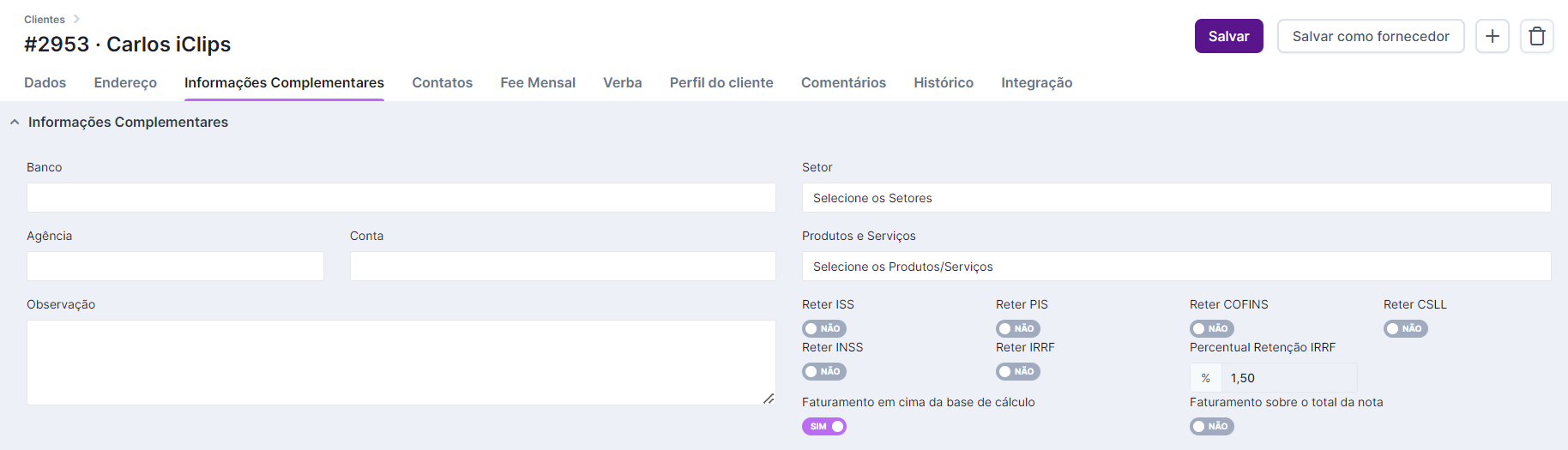 Na tela Informações Complementares, você insere informações exclusivas do cliente, como dados de conta bancária, descontos exclusivos, tipo de faturamento combinado, condição e data de pagamento, entre outros. O preenchimento de todos esses detalhes, auxiliará bastante no financeiro do iClips, principalmente na parte dos lançamentos.