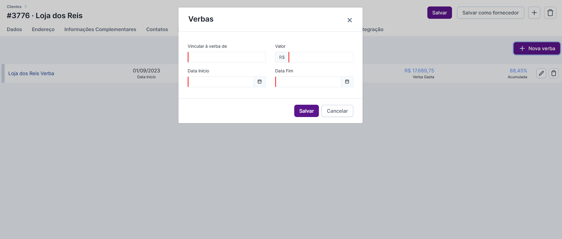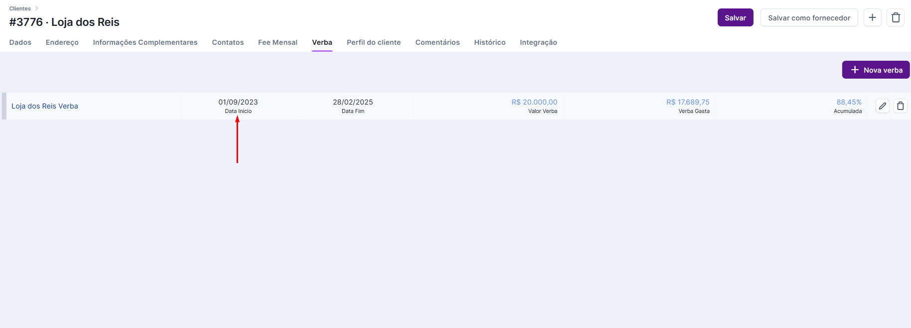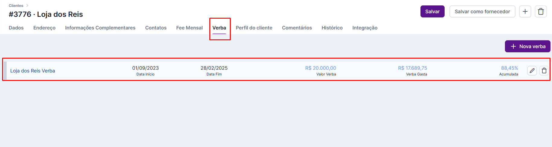Ainda em Configurações > Clientes > vá na aba “Verba”.