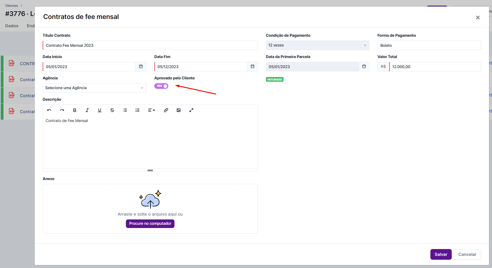 Ao marcar o botão “aprovado pelo cliente” você poderá vincular os projetos àquele fee mensal e ele é encaminhado para o Pré-Lançamento Financeiro.