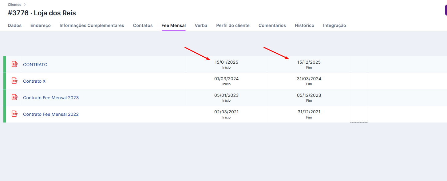 - DATA DE INÍCIO E FIM: Para vincular um projeto a um Fee Mensal, a data de cadastro do projeto tem que ser a mesma ou após a data de início desse Fee Mensal, do contrário, o cadastro não será possível. Da mesma forma, a data de inclusão do projeto não pode ser após a data fim do contrato.