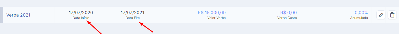 DATA DE INÍCIO E FIM: Para que a verba apareça como opção, a data de início da verba precisa ser menor do que a data do dia da criação do projeto, e a data fim da verba precisa ser maior.