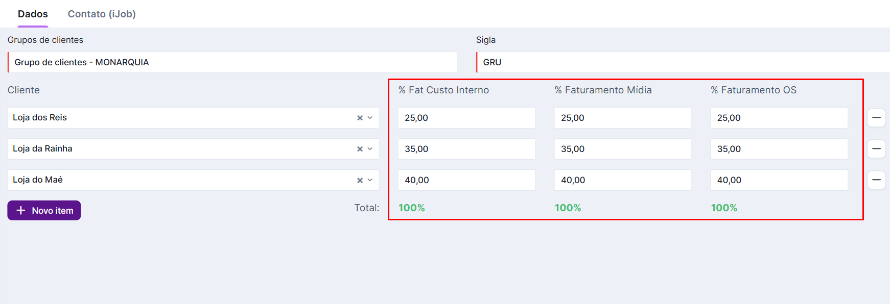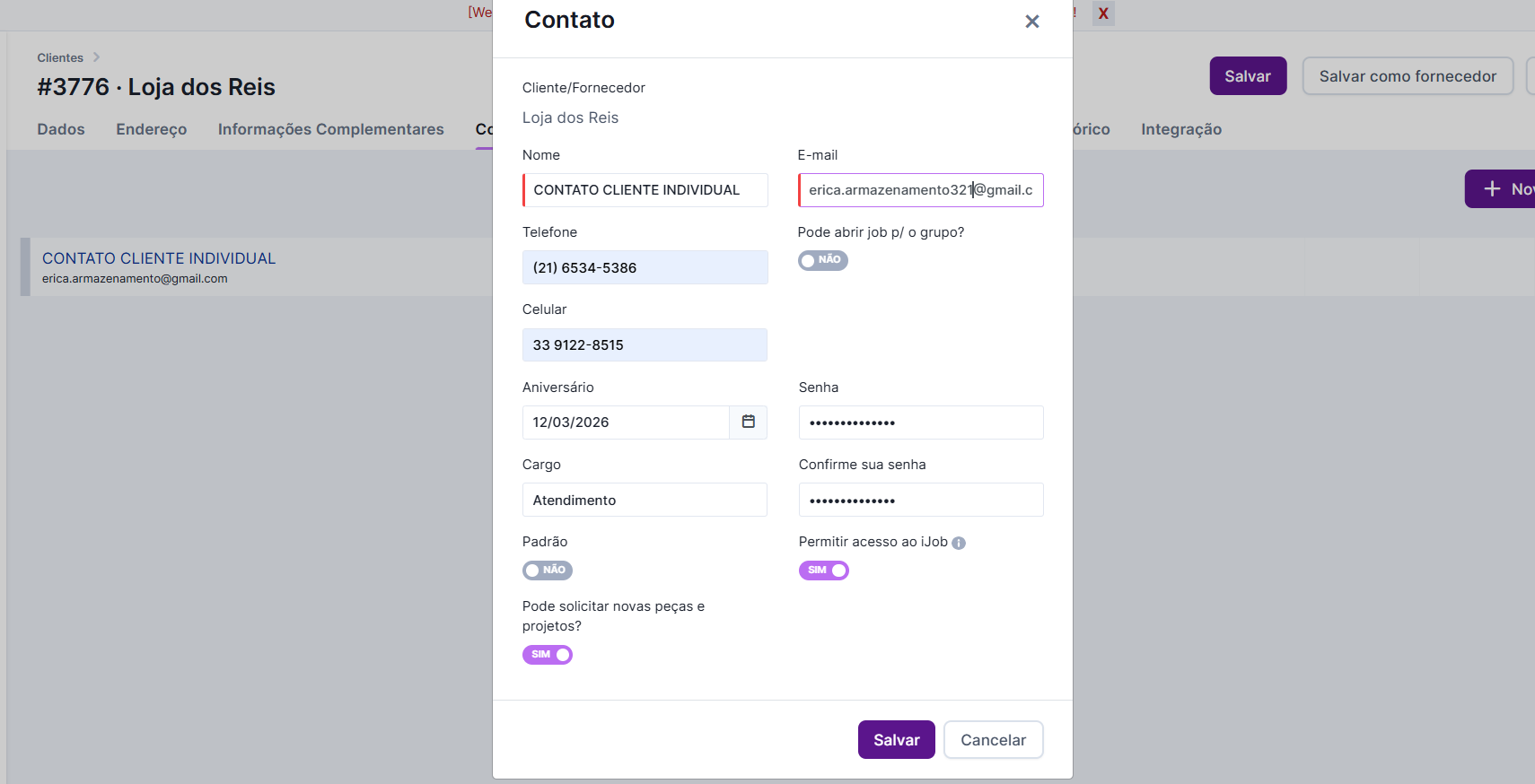 Feito isso, acesse a aba “Contato (iJob)” dentro do grupo de clientes (configurações > grupo de clientes > editar > contato (iJob).) e realize o cadastro: