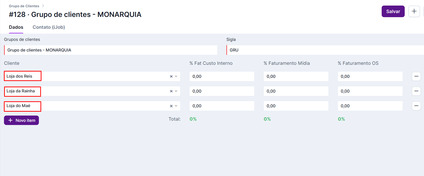 Clique no botão “Novo grupo de clientes” e vá adicionando os respectivos CNPJs, cadastrados anteriormente.