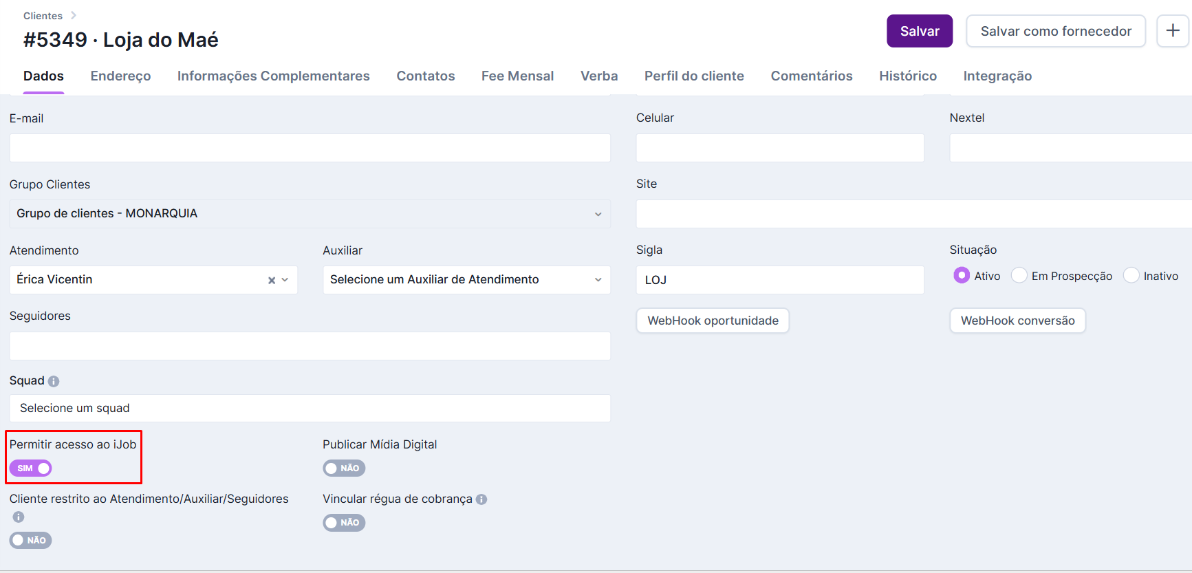 - Permitir acesso ao IJOB: ative essa flag caso o cliente vá utilizar o “módulo do cliente” para aprovar peças e solicitar novos projetos e peças para a agência.