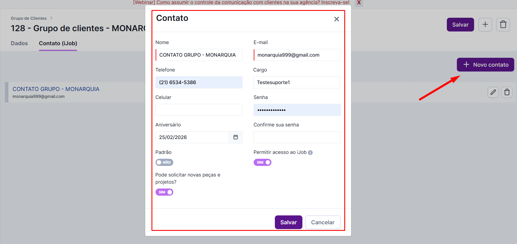 OBS: Ao marcar a opção “Pode abrir job p/ o grupo?”, o contato desse cliente, caso faça parte de um grupo de clientes, poderá abrir projeto para todos os clientes do grupo.
