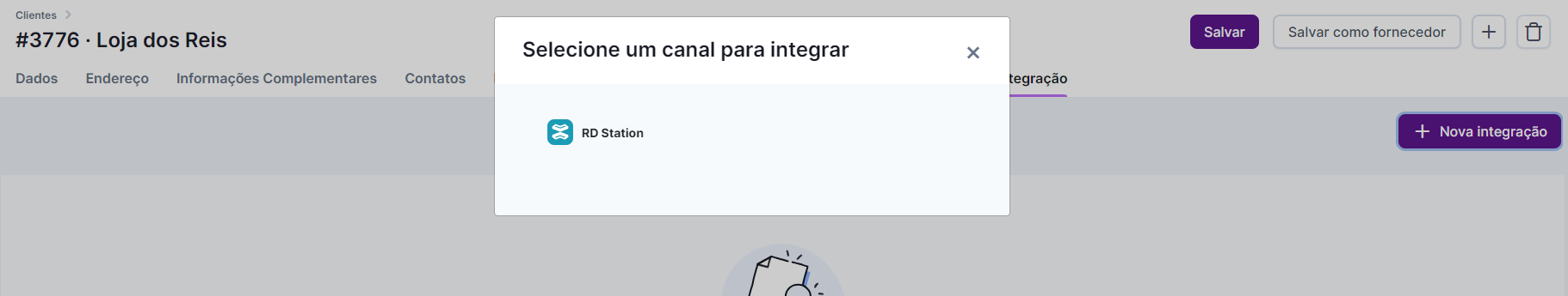 E por fim, há a Integração, seção na qual você irá vincular a conta do RD Station do seu cliente.