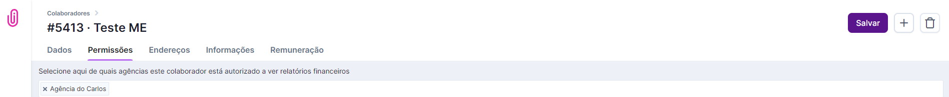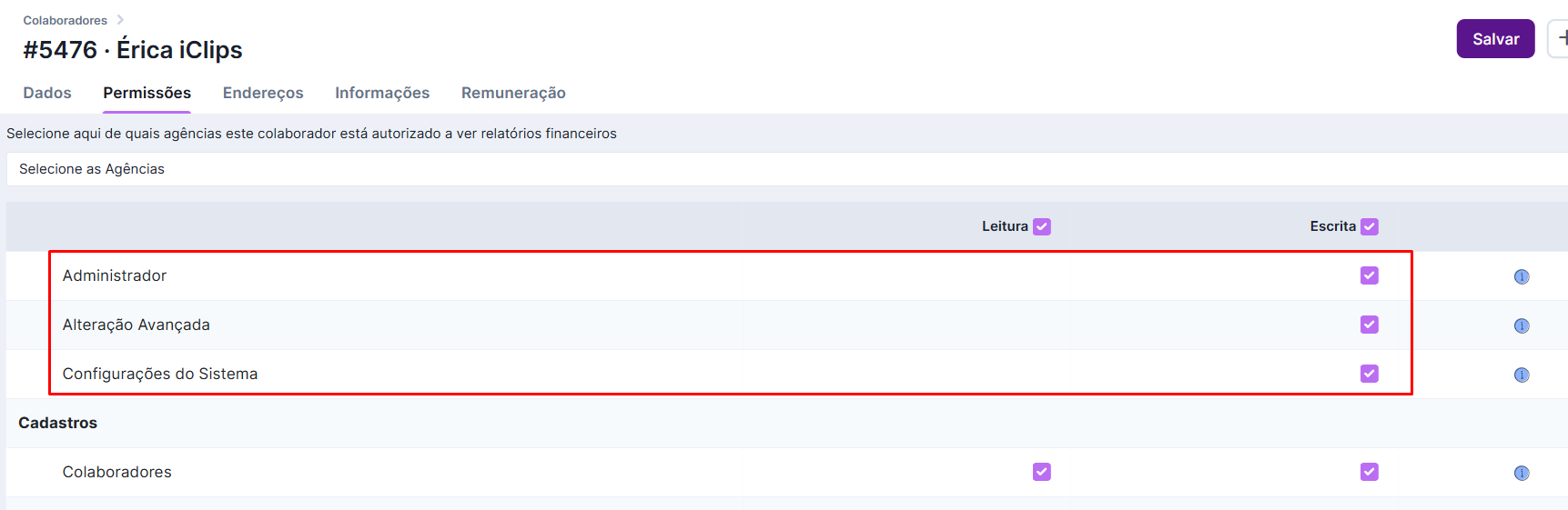 RELATÓRIOS FINANCEIROS: Caso o colaborador vá visualizar relatórios financeiros da agência, além das permissões pertinentes, é necessário inserir, no topo da listagem, o nome das agências as quais ele poderá ter acesso aos relatórios: