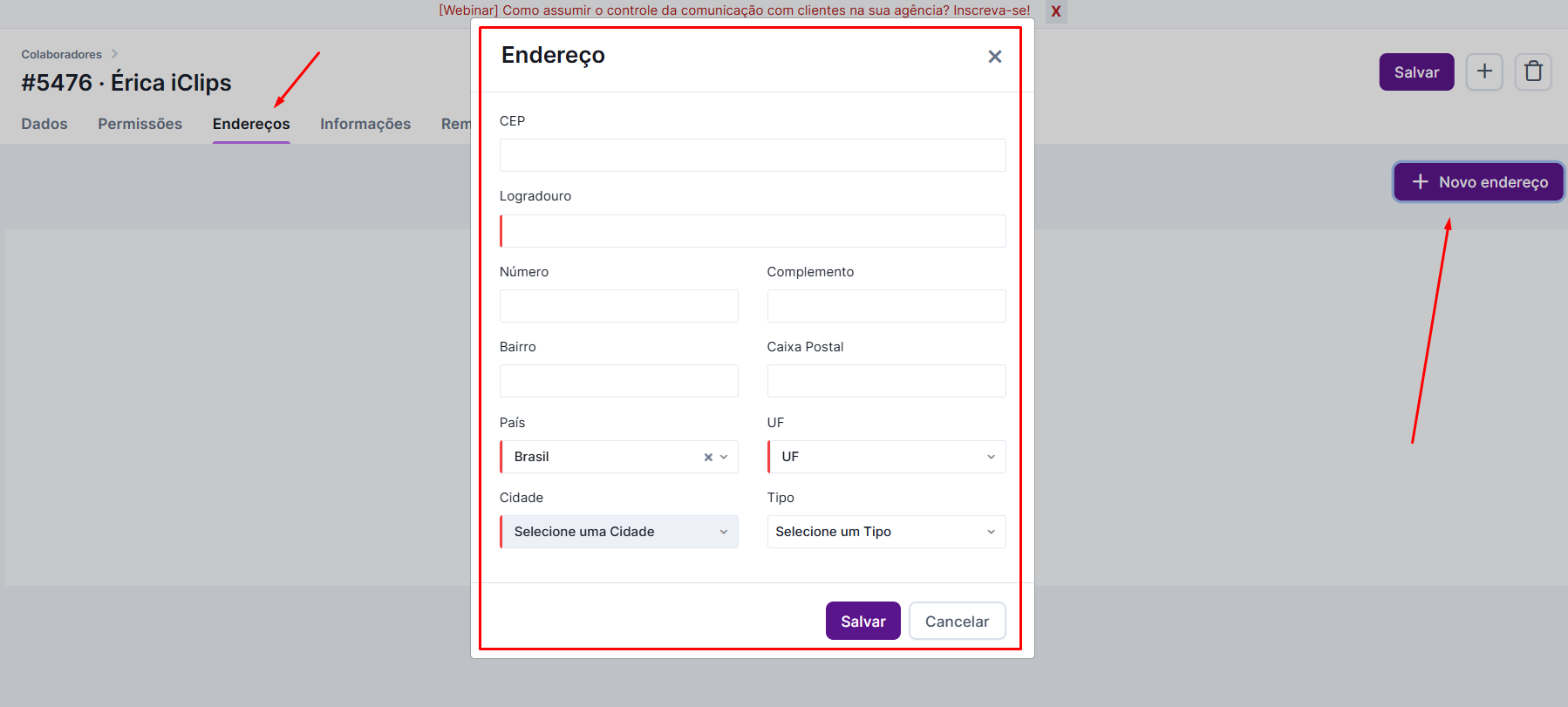 Você também pode cadastrar o(s) endereço(s) dos seus colaboradores. Ao acessar a aba Endereço, basta clicar no botão “+ Novo endereço”. Um pop up de preenchimento se abrirá para que as informações sejam inseridas.