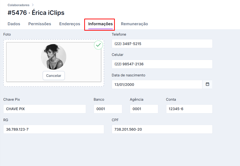 Na aba Informações você pode inserir outros dados do colaborador: