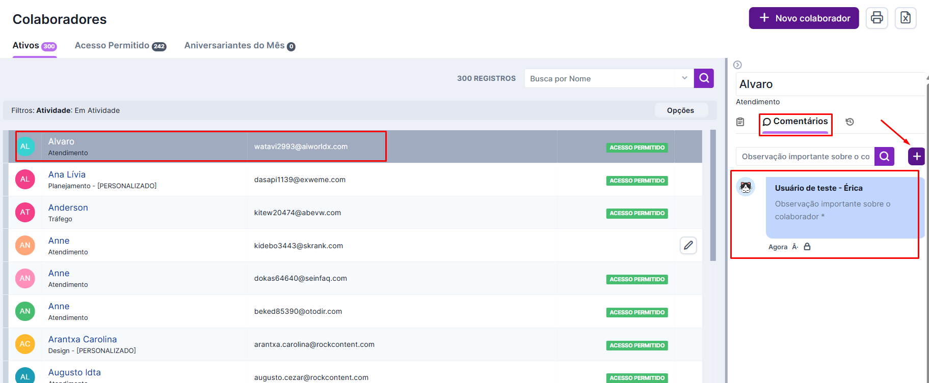 Para isso, vá na página inicial dos colaboradores, clique em cima do cadastro desejado e vá na aba “comentários”: