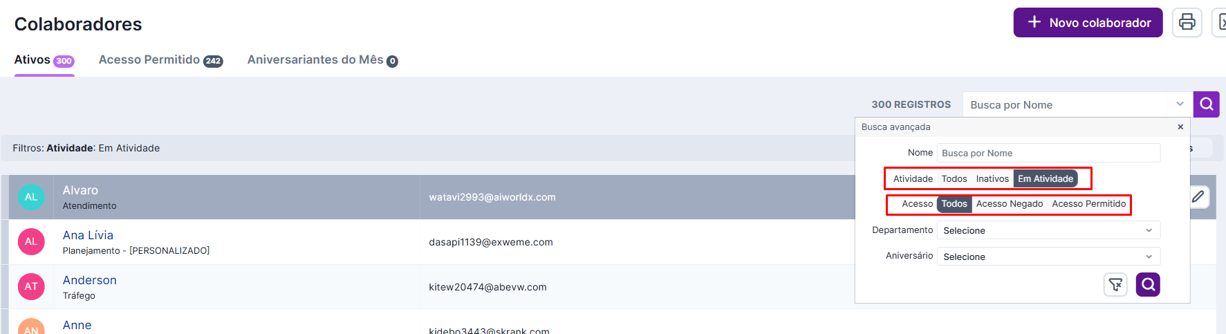 Você pode fazer uma busca por “todos”, considerando o botão de “acesso ao sistema” e o de “colaborador ativo ou inativo”.
