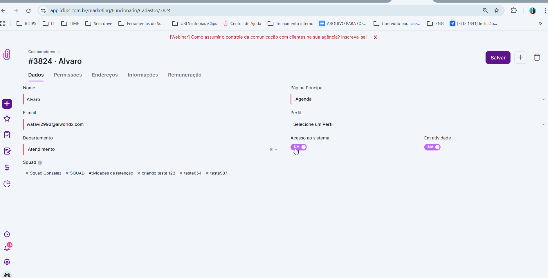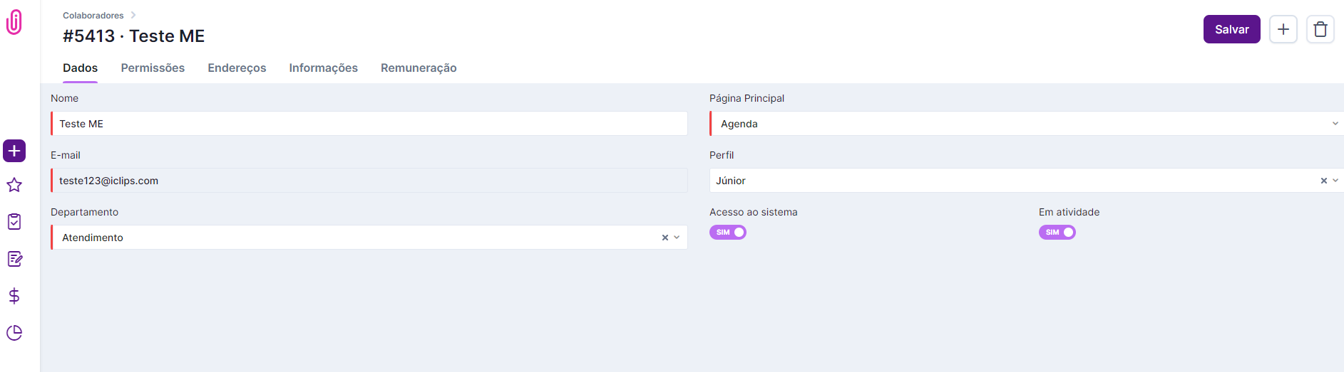 - Se ele terá acesso ao iClips ou se estará apenas cadastrado para constar na sua gestão Financeira. Você definirá isso através da ativação ou inativação das flags “Acesso ao sistema” e “em atividade” mostradas na imagem acima.