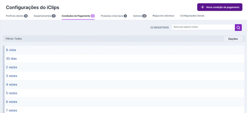 Ao final, você terá uma listagem das opções de pagamento cadastradas, juntamente com os recursos para edição eou exclusão dos itens. Você também poderá usar a busca avançada para filtrar as condições de pagamento que você deseja.