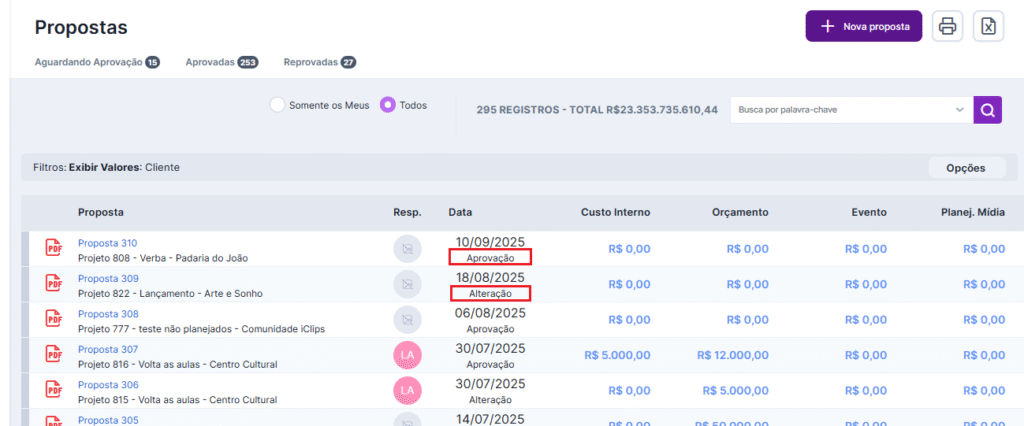 - Data de modificação: aqui será considerada a data da última modificação na proposta, estando ela aprovada ou aguardando aprovação. A data considerada é a mesma que aparece na lista de propostas como sinalizado no print abaixo: