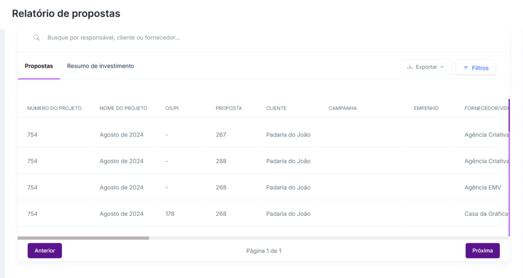 O relatório de Resumo de Investimento vai mostrar o quanto seus clientes investiram em cada item de uma proposta. As informações deste relatório se baseiam nas propostas.