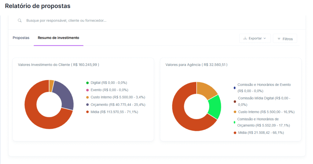 Ao abrir a aba “resumo do investimento”, dois gráficos de pizza irão aparecer em sua tela. No primeiro vão constar valores que foram investidos pelo cliente, divididos por tipo de investimento. No segundo, constarão os valores que efetivamente são da agência, divididos também por tipo.