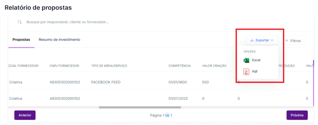 - Status da proposta: selecione se deseja ver somente propostas aprovadas ou também as reprovadas e aguardando aprovação.