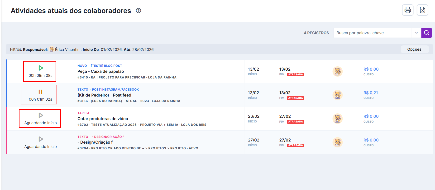 Após realizar a pesquisa, o sistema exibe os resultados em forma de lista, mostrando o total de peças em cada situação: com o “play” acionado, pausadas ou ainda aguardando início. O relatório também apresenta o custo acumulado de cada atividade até o momento, calculado com base no valor/hora cadastrado para o colaborador responsável.
