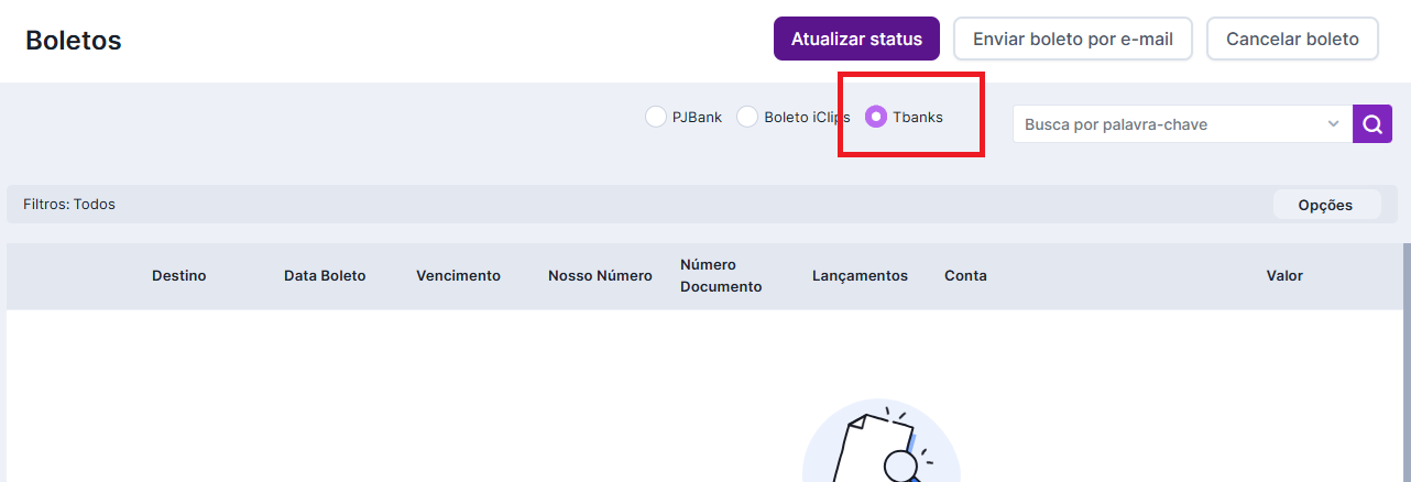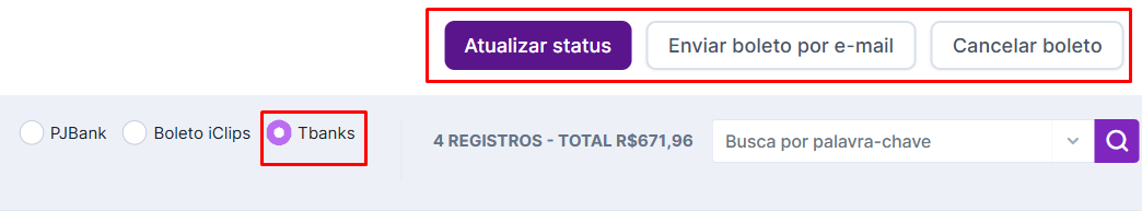 Se selecionada a opção “Tbanks” você tem a opção de alterar o status do boleto, enviar o boleto por e-mail ou cancelar.