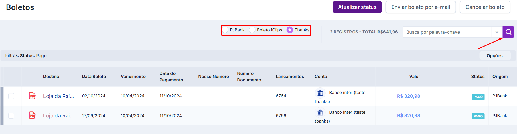 Feito isso, na parte superior da tela, você pode selecionar a visualização de Boletos PJBank ou Boletos iClips (boletos com registro).