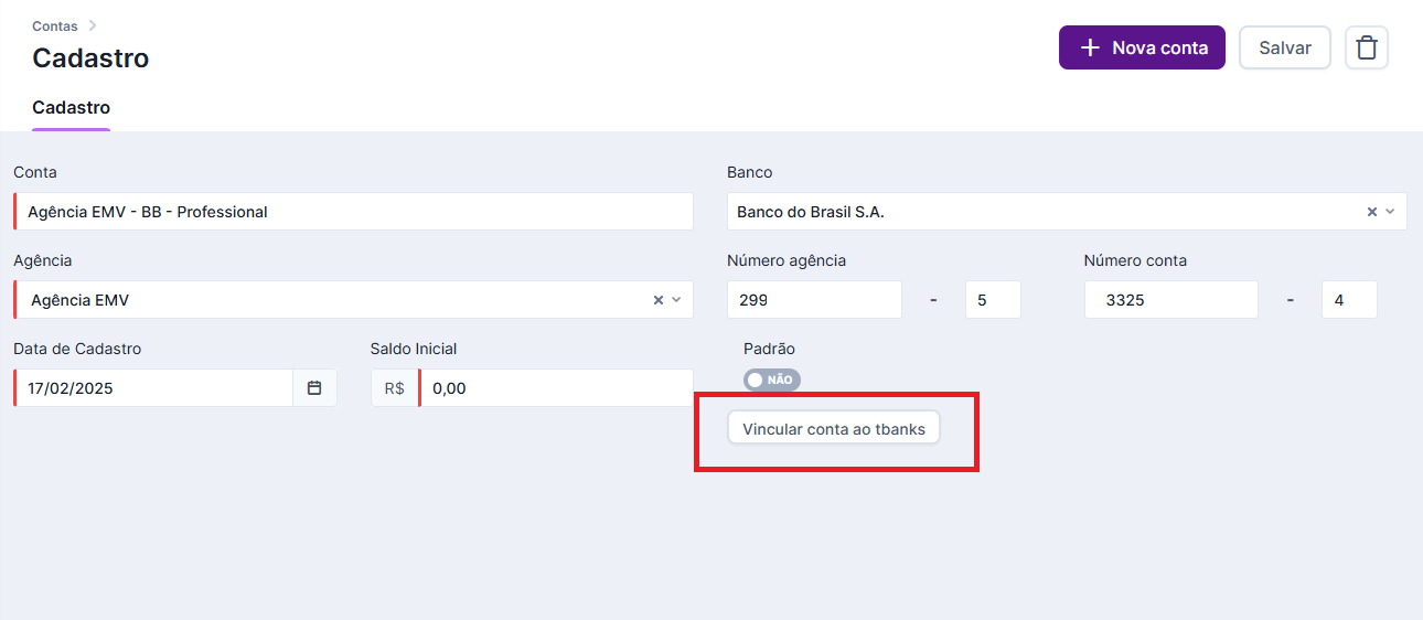 Em financeiro > contas, você poderá criar uma nova conta no “+Nova Conta” ou editar uma conta já existente para verificar se está tudo correto. Se for uma nova conta a ser cadastrada no iClips, o botão para vincular conta ao tbankS ficará disponível apenas após salvá-la: