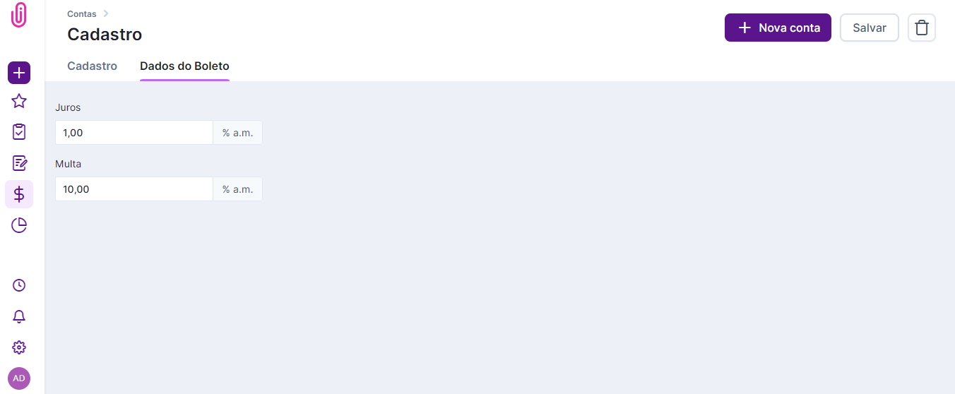 Acessando a aba “dados do boleto” será possível cadastrar um padrão de juros e multa: